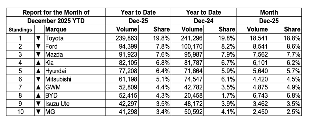 Toyota was the market leader in 2025 with 239,863 vehicles sold, representing approximately 19.8 per cent of the total market. It was followed by Ford (94,399), Mazda (91,293), Kia (82,105) and Hyundai (77,208).