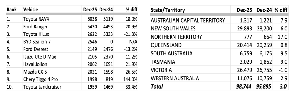 Australia’s new vehicle market closed the year on a solid note in December 2025, with 98,744 new vehicles sold, an increase of 3 per cent compared with December 2024.