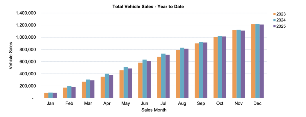 - The December 2025 market of 98,744 shows an increase in new vehicle sales of 2,849 (3.0%) compared to December 2024 (95,895). There were 25 selling days in December 2025 compared to 24 in December 2024 resulting in a decrease of 45.9 vehicle sales per day in December 2025.