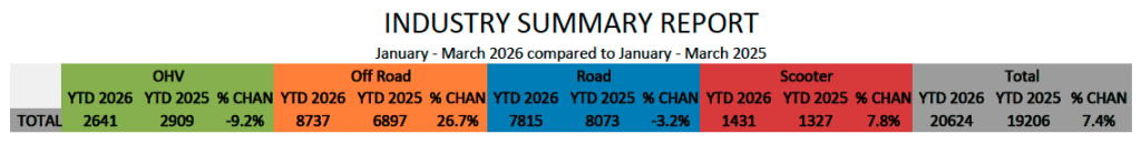 From January to March 2026, 20,624 motorcycles, off-highway vehicles, and scooters were sold, representing a 7.4 per cent increase over the same period in 2025.